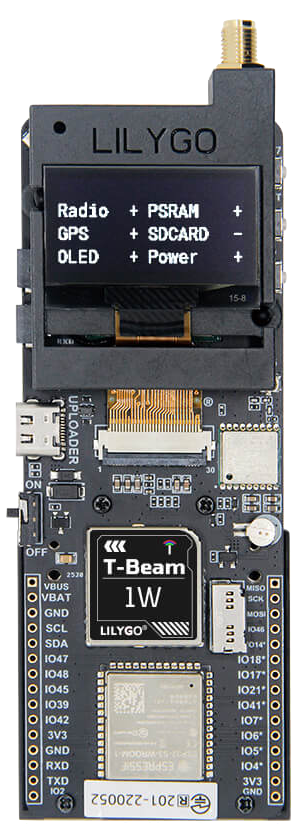 Hochleistungs-LoRa-Board von LilyGo auf ESP32-S3-Basis mit 1W-Leistungsverstärker (PA) und LNA. TX-Leistung bis 32 dBm – die höchste aller gängigen MeshCore-Boards. SX1262-Transceiver mit integriertem PA/LNA-Schaltkreis. L76K GNSS, 1,3'' SH1106 OLED, MicroSD-Slot, AXP2101 PMU, Qwiic-Connector. Betrieb mit 7,4V-Akku (2S LiPo), inkl. Kühlventilator bei Hochleistungsbetrieb. 16 MB Flash, 8 MB PSRAM. MeshCore Companion-Firmware ab v1.13.0.