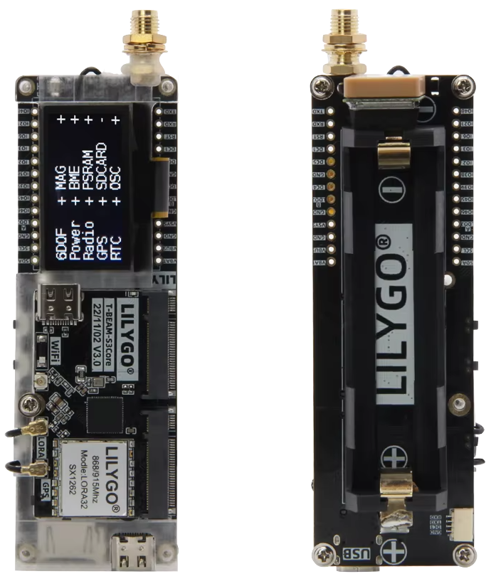 High-End-Board mit ESP32-S3FN16R8, M.2-Steckplatz für LoRa-Module, GPS (NEO-6M), 18650-Akku-Halterung und AXP2101 Power-Management. Solar-Eingang, Altimeter. Community-Firmware: Companion BLE/USB, Repeater, Room Server.